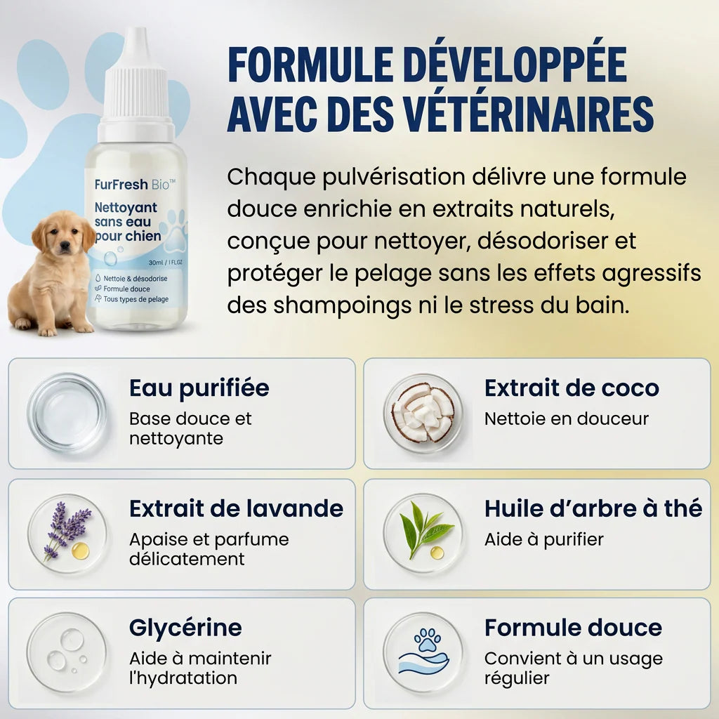 Ajoutez quelques gouttes pour nettoyer le pelage sans bain ni rinçage.